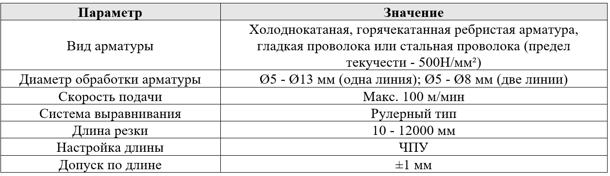 Роботизированный станок для правки и резки холоднокатаной, горячекатаной ребристой арматуры диаметром от 5 до 13 мм (одна линия) или от 5 до 8 мм (две линии). Максимальная скорость подачи 100 м/мин. Система выравнивания рулерного типа. Длина резки от 10 до 12000 мм. Настройка длины ЧПУ, допуск по длине ±1 мм.