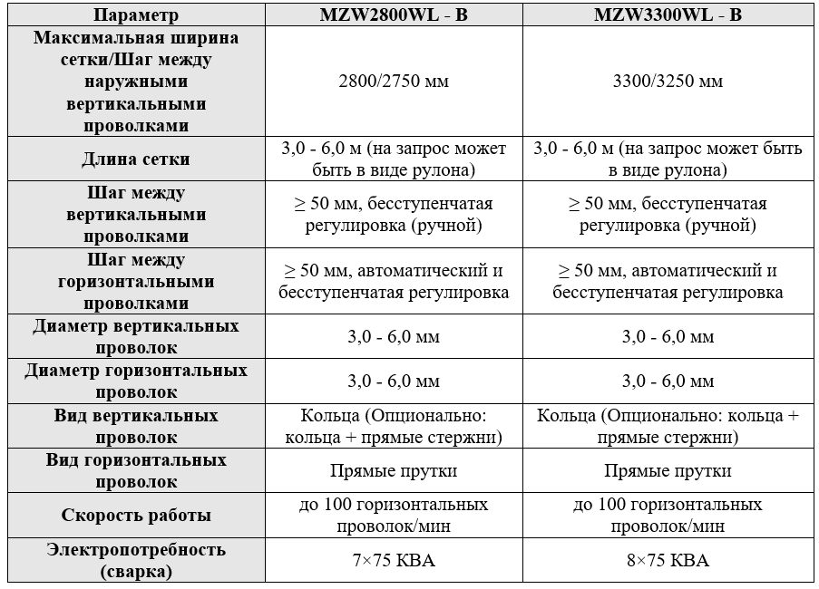 Роботизированный комплекс для сварки сетки максимальной шириной 2800/2750 мм. Длина сетки 3,0-6,0 м (на запрос может быть в виде рулона). Шаг между вертикальными и горизонтальными проволками 50 мм. Диаметр проволок 3,0-6,0 мм. Вертикальные проволоки - кольца (опционально кольца + прямые стержни). Скорость работы до 100 горизонтальных проволок/мин.
