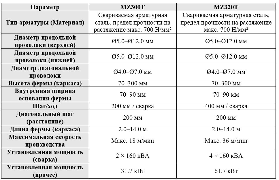 Роботизированный комплекс для сварки решетчатых балок. Свариваемая арматурная сталь с пределом прочности на растяжение макс. 700 Н/мм. Диаметр продольной проволоки (верхней и нижней) 5,0-12,0 мм, диагональной 4,0-7,0 мм. Высота фермы 70-300 мм, внутренняя ширина основания 70-90 мм. Длина фермы 2,0-14,0 м. Максимальная скорость производства 18 м/мин.