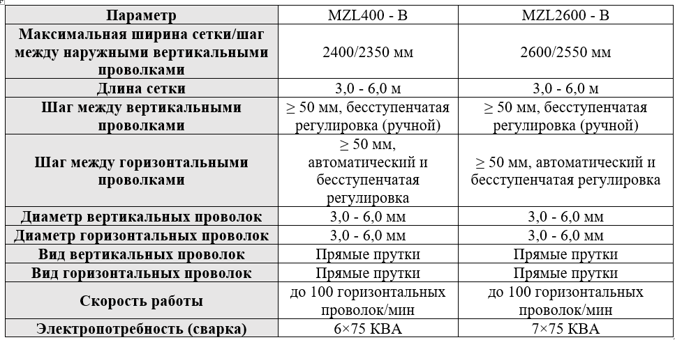 Роботизированный комплекс для сварки сетки максимальной шириной 2400/2350 мм. Длина сетки 3,0-6,0 м. Шаг между вертикальными и горизонтальными проволками 50 мм. Диаметр проволок 3,0-6,0 мм. Оба типа проволок - прямые прутки. Скорость работы до 100 горизонтальных проволок/мин. Электропотребление 6х75 КВА.