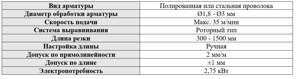 Роботизированный станок для правки и резки полированной или стальной проволоки диаметром от 1,8 до 3 мм. Максимальная скорость подачи 35 м/мин. Система выравнивания роторного типа. Длина резки от 300 до 1500 мм. Допуск по прямолинейности 2 мм/м, допуск по длине ±1 мм. Электропотребление 2,75 кВт.