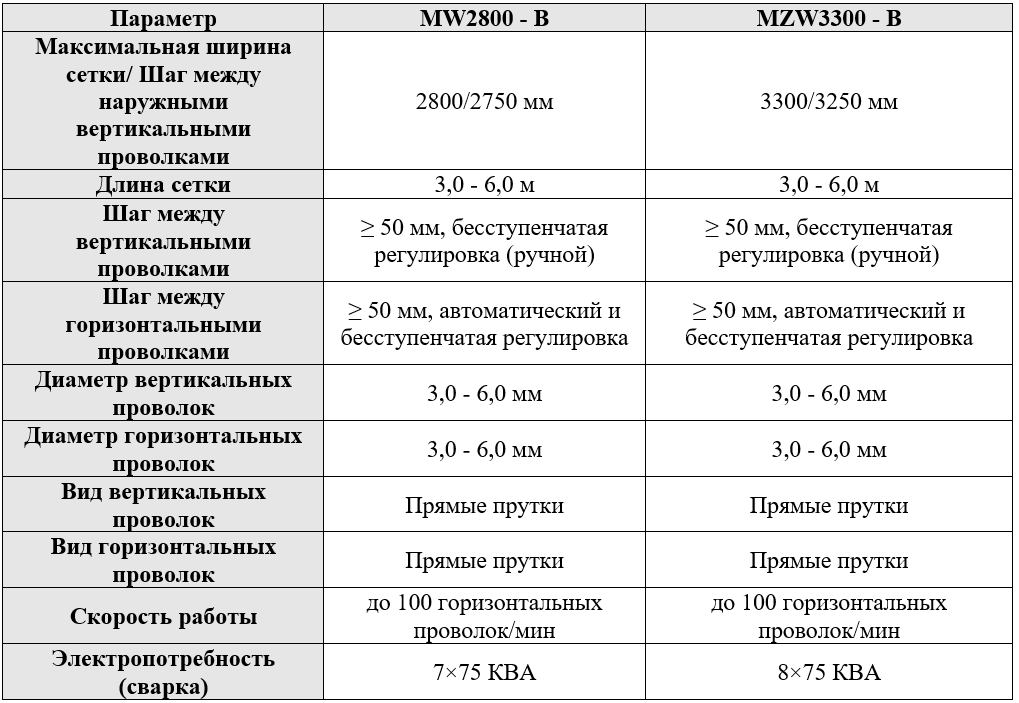 Роботизированный комплекс для сварки сетки максимальной шириной 2800/2750 мм. Длина сетки 3,0-6,0 м. Шаг между вертикальными и горизонтальными проволками 50 мм. Диаметр проволок 3,0-6,0 мм. Оба типа проволок - прямые прутки. Скорость работы до 100 горизонтальных проволок/мин. Электропотребление 7х75 КВА.