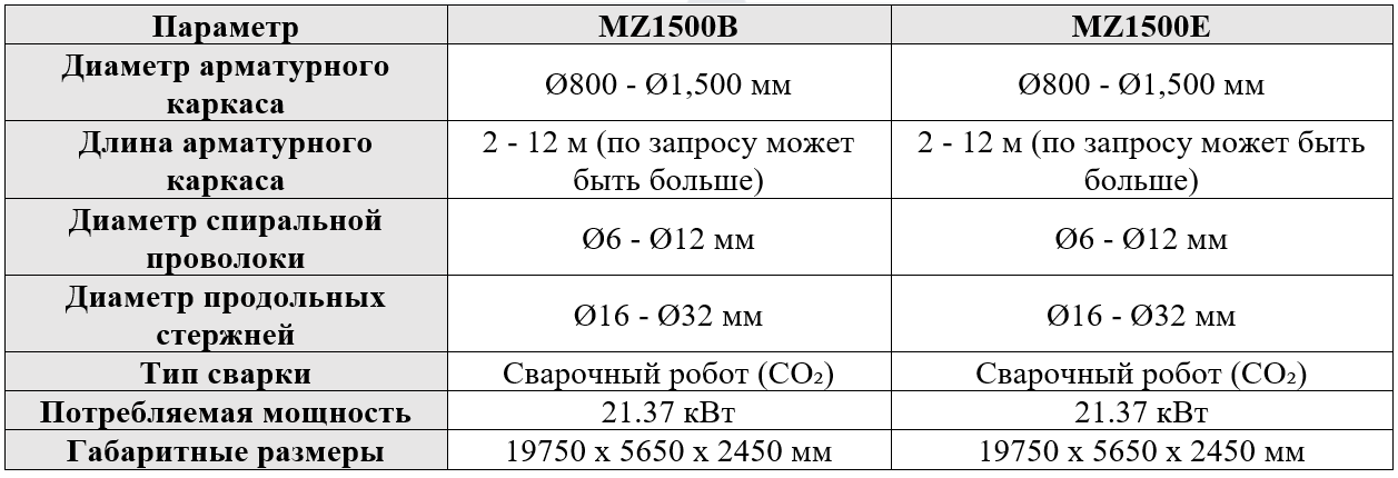 Роботизированный комплекс для производства арматурных клеток диаметром от 800 до 1500 мм. Длина арматурного каркаса 2-12 м (по запросу может быть больше). Диаметр спиральной проволоки 6-12 мм, продольных стержней 16-32 мм. Тип сварки - сварочный робот (CO). Потребляемая мощность 21,37 кВт. Габаритные размеры 19750х5650х2450 мм.