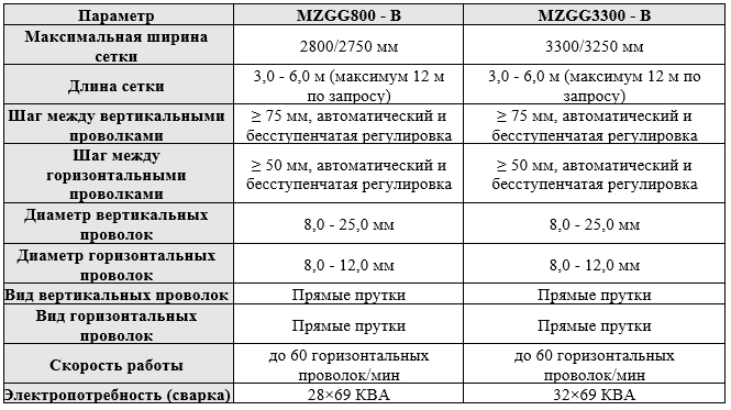 Роботизированный комплекс для сварки усиленной сетки максимальной шириной 2800/2750 мм. Длина сетки от 3,0 до 6,0 м. Шаг между вертикальными проволками 75 мм, между горизонтальными 50 мм. Диаметр вертикальных проволок 8,0-25,0 мм, горизонтальных 8,0-12,0 мм. Скорость работы до 60 горизонтальных проволок/мин. Электропотребление 28?69 КВА.