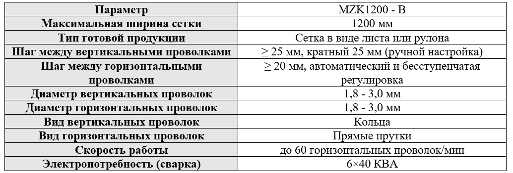 Роботизированный комплекс для сварки сетки максимальной шириной 1200 мм. Тип готовой продукции - сетка в виде листа или рулона. Шаг между вертикальными проволками ?25 мм (ручная настройка), между горизонтальными ?20 мм. Диаметр проволок 1,8-3,0 мм. Вертикальные проволоки - кольца, горизонтальные - прямые прутки. Скорость работы до 60 горизонтальных проволок/мин.