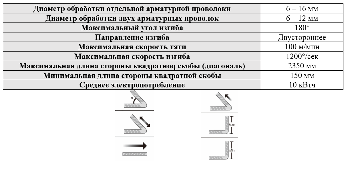 Роботизированный станок для гибки проката в скобу. Диаметр обработки отдельной арматурной проволоки 6-16 мм, двух арматурных проволок 6-12 мм. Максимальный угол изгиба 180°, двустороннее направление изгиба. Максимальная скорость тяги 100 м/мин, скорость изгиба 1200°/сек. Размеры скоб: диагональ от 150 до 2350 мм.